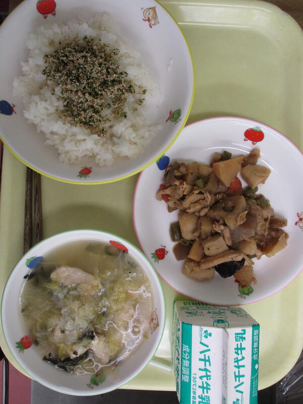 ご飯 たらことしらすのふりかけ がめ煮 水炊き風汁物 牛乳 |