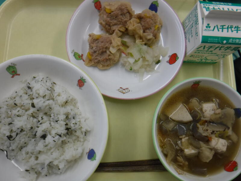 ・わかめシラスご飯 ・蒸しシュウマイ ・ゆずか大根 ・けんちん汁 ・牛乳 |