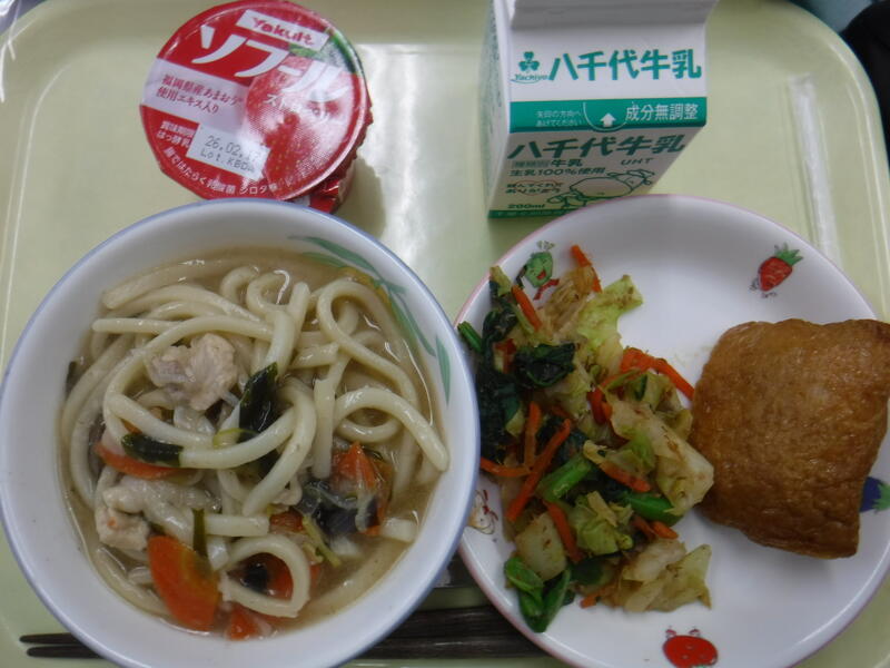 ・いなりずし ・わかめとろみうどん ・おかかあえ ・いちごヨーグルト ・牛乳 |
