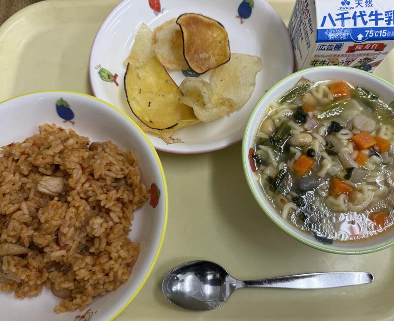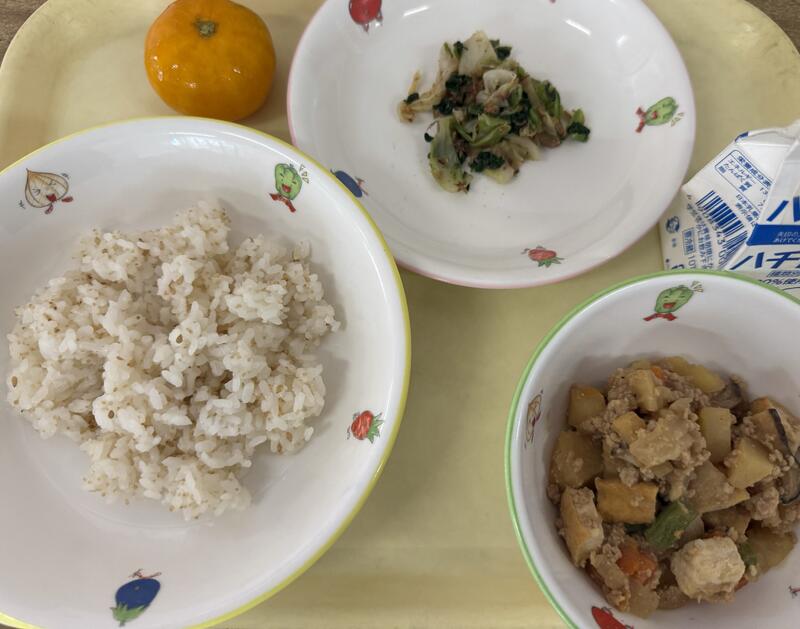 | コメント | 給食の食器の並べ方は、和食の基本的な型にそった並べ方をしています。ごはんは左手手前、汁物は右手前、おかずは奥、はしは食べるほうを左にして手前に横にして並べます。和食は、ごはんを中心とした食べ方をします。ごはんを食べたらおかず、そしてまたごはん・・と、交互に口に入れ、味を口の中で整えながら食べる口中調理と呼ばれる食べ方をします。 |