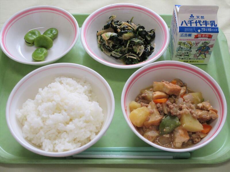 | コメント | 大豆とれんこんのカレー、確かにれんこんを食べるとよく噛むので、ささっとは食べられないですね。尚かつ、カレーにも合います。シャクシャクしておいしかったです。さつまチップスは、パリパリとしっとりが同居していて、食感を楽しめました。今日はカミカミデー?と思うほど、噛むには適していたメニューでしたね。グリーンサラダもよく噛み、おいしかったです。 |