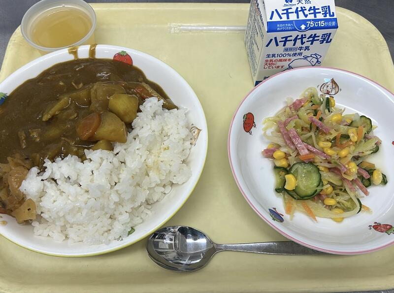 ごはん ポークカレー サラミのサラダ りんごゼリー 牛乳 |