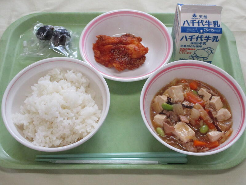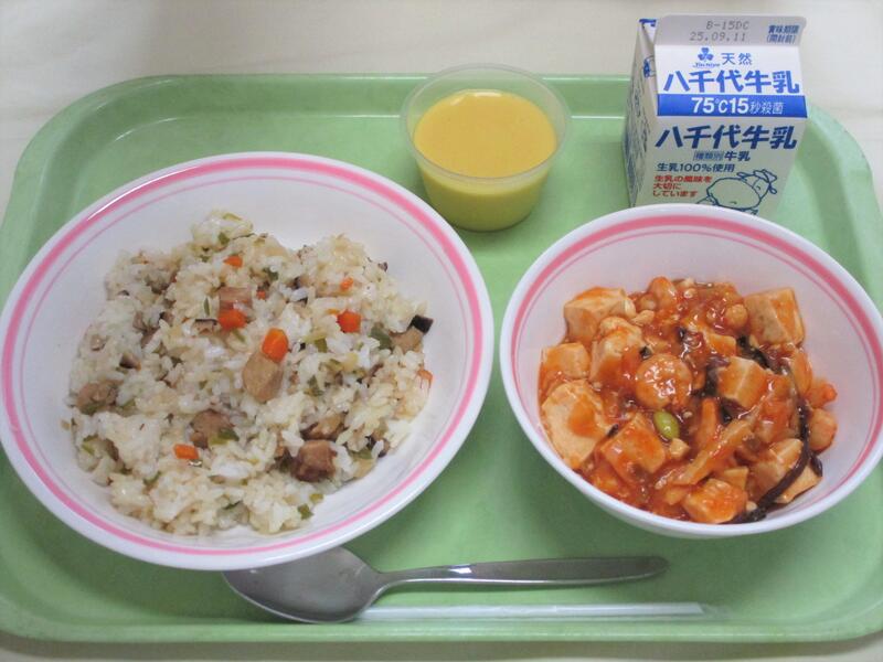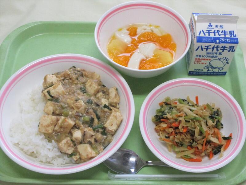 あじさいごはん 家常豆腐 さつまいもとじゃこのカリカリ揚げ 牛乳 |
