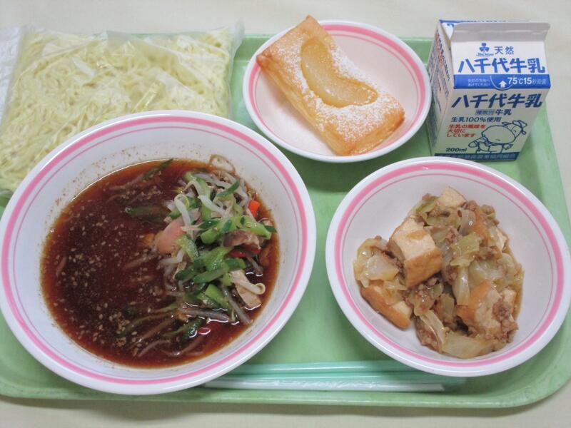 | コメント | みそラーメンはピリ辛のスープに具材がたっぷり入り、最後まで美味しく食べられました。チキチキごぼうは歯ごたえが良く、コリコリとした食感が楽しめました。デザートのアップルパイは、甘酸っぱいりんごとサクサクのパイ生地がよく合い、とても美味しかったです。寒い季節にぴったりの、体が温まる給食でした。 |
