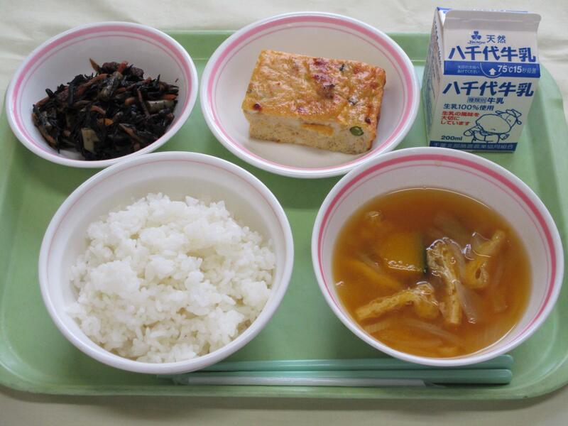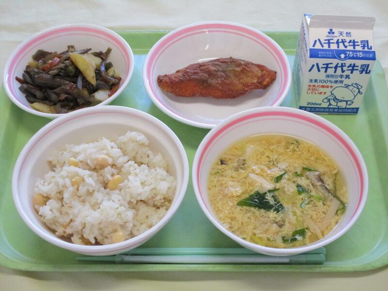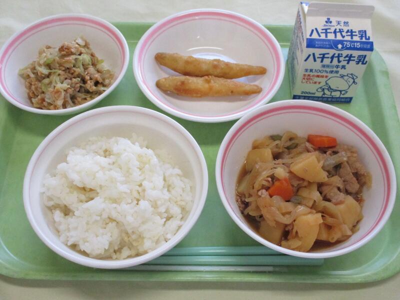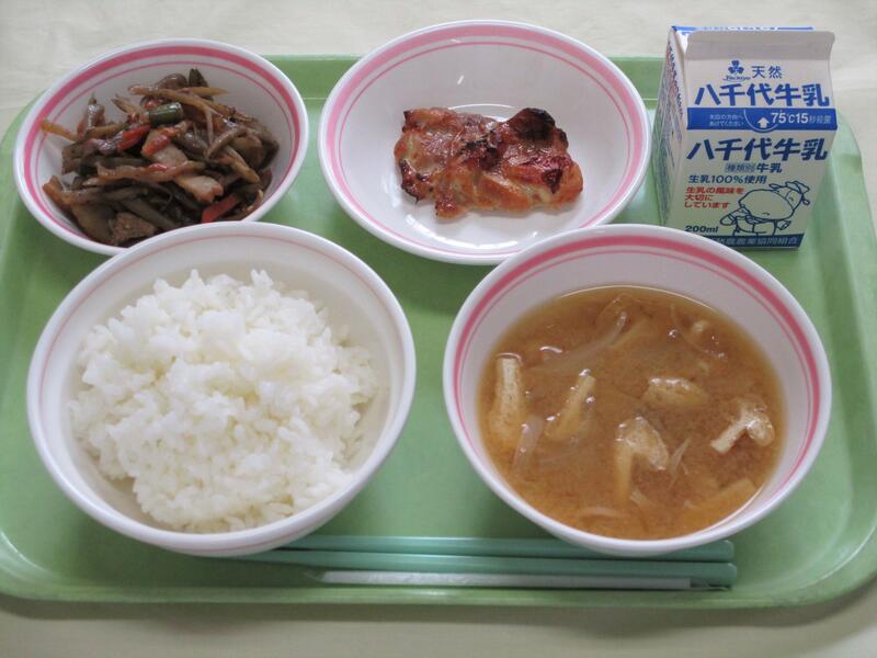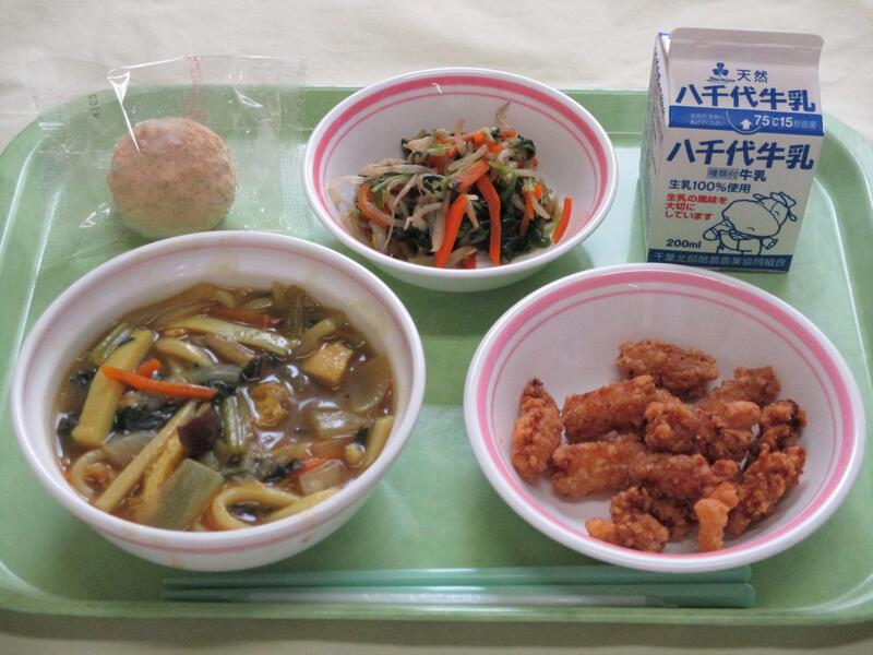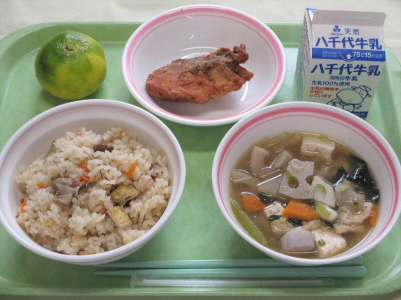 ごはん 鶏の唐揚げ 切干大根の炒め物 じゃがいもと玉ねぎのみそ汁 牛乳 |