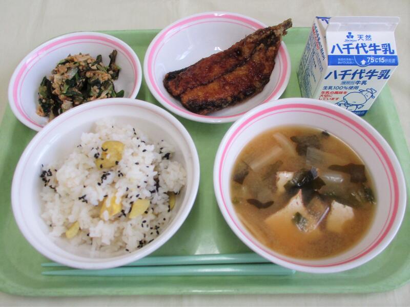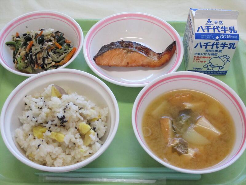 ごはん あじのさんが焼き 青菜のごま和え さつまいものみそ汁 びわゼリー 牛乳 |