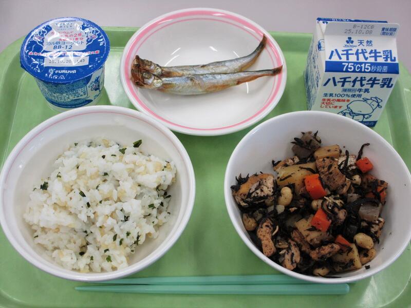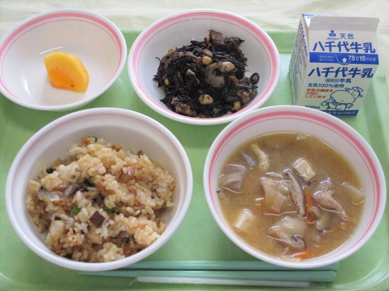 炊き込みご飯 にしんの竜田揚げ ひじきとツナの炒め煮 沢煮椀 牛乳 |