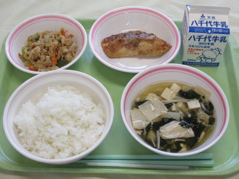 ごはん あぶたま丼(具) 茎わかめのきんぴら 油揚げともやしのみそ汁 牛乳 |