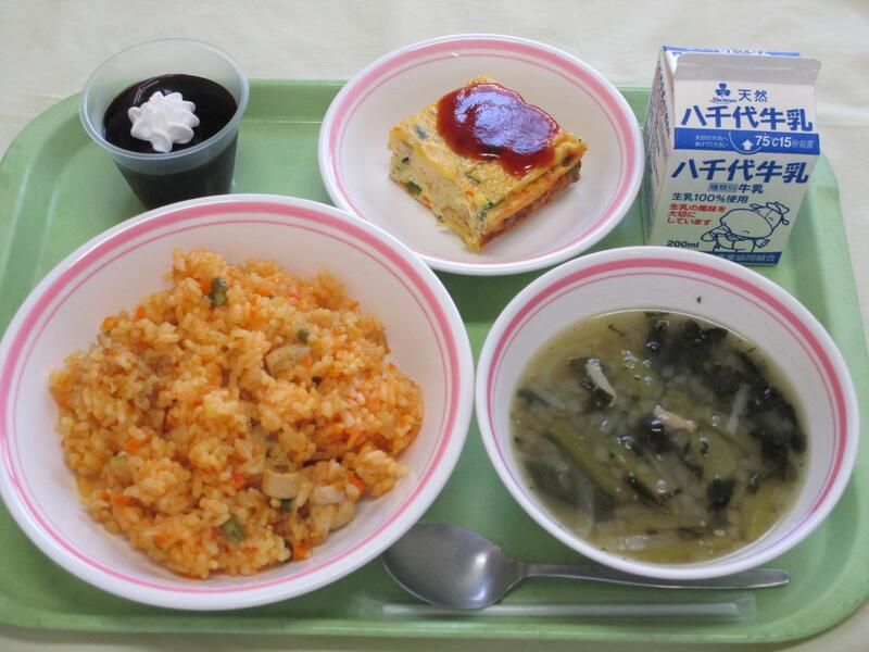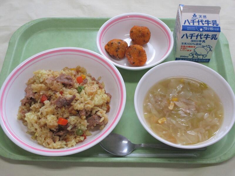 カレーピラフ グリンピース入りスクランブルエッグ キャベツスープ 冷凍みかん 牛乳 |
