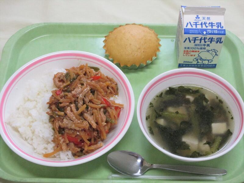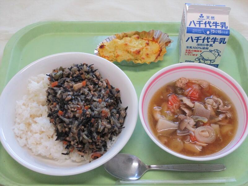 麦ごはん 肉みそひじき丼(具) 芋煮汁 スイートポテト 牛乳 |