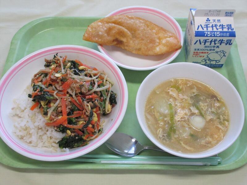 | コメント | 麦ごはんのちょっとプチッとした食感と、ビビンバの具がとても合っていておいしかったです。半分は盛られたまま、あとの半分はごはんと混ぜて食べました。やはり混ぜて食べた方が味が広がりますね。生徒たちはどのように食べるでしょうか。トック入り卵スープも、かぼちゃの包み揚げもとてもおいしくて、包み揚げはデザート的な位置付けでしたね。とてもおいしかったです。ごちそうさまでした。 |