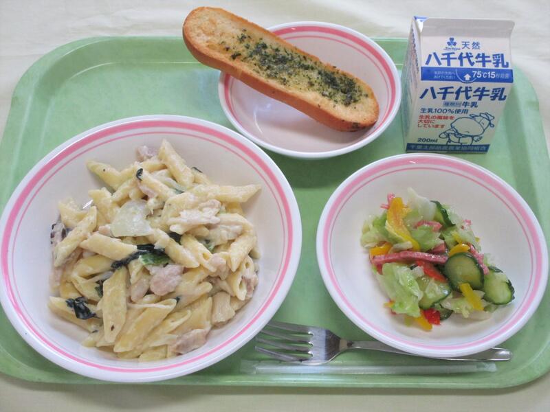 きのこの豆乳クリームペンネ イタリアンサラダ ミニガーリックトースト 牛乳 |