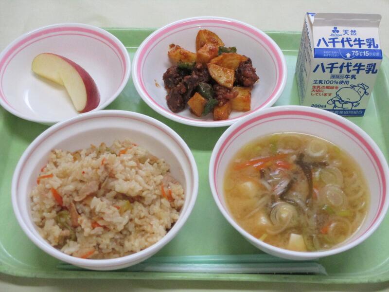 たこ飯 にしんの唐揚げ 野菜あんかけ とうがん汁 牛乳 |