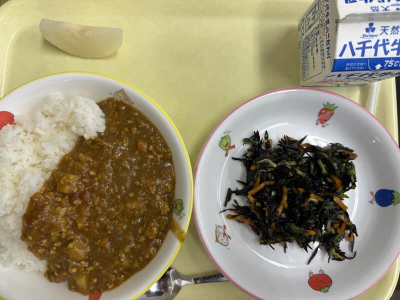 ごはん キーマカレー ひじきのマリネ いちかわの梨 牛乳 |