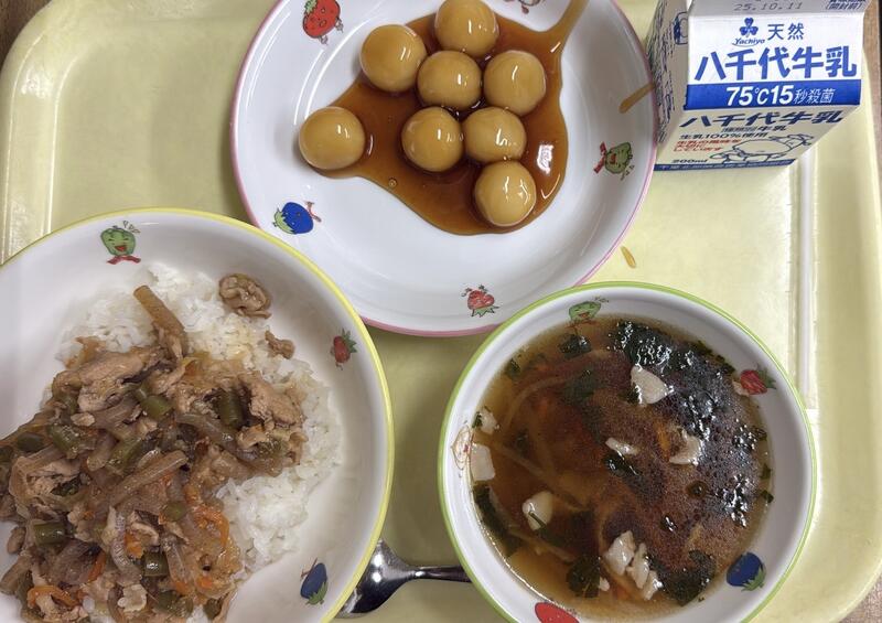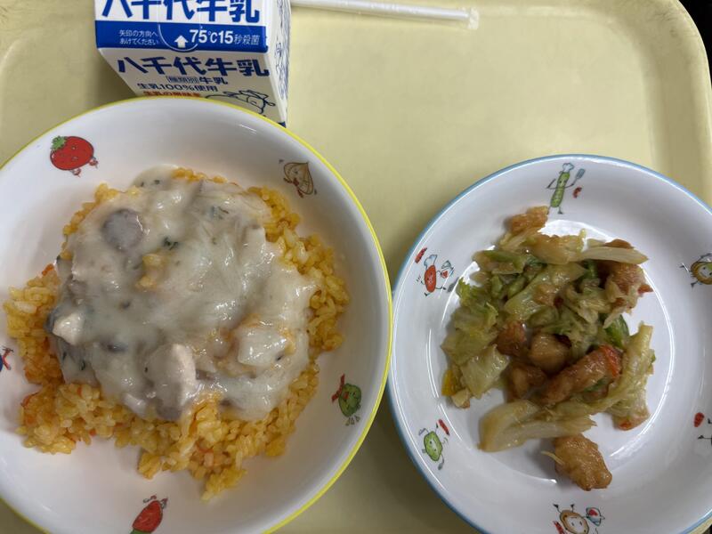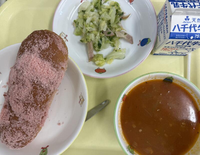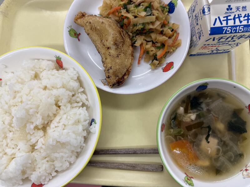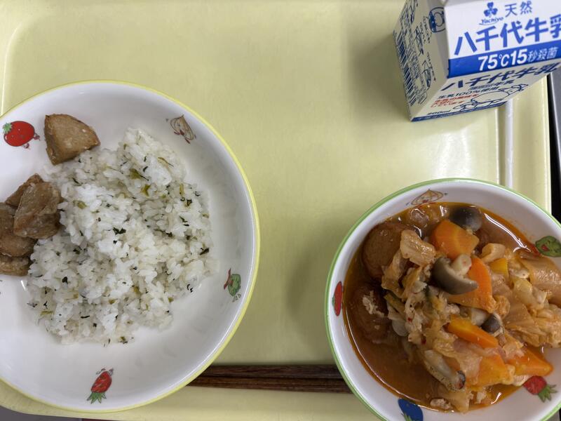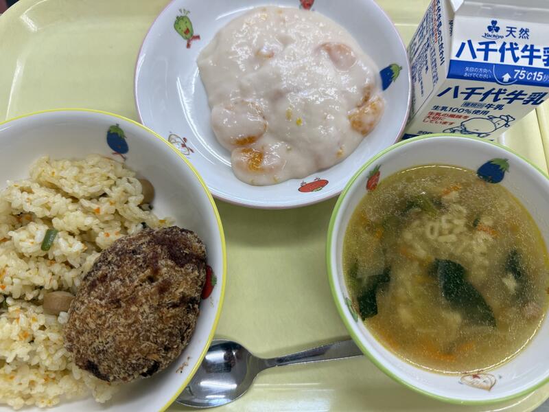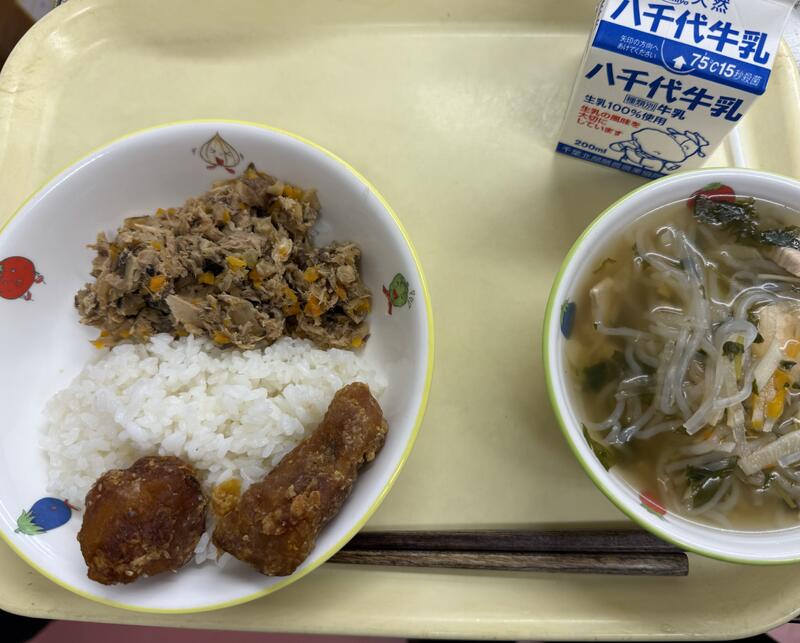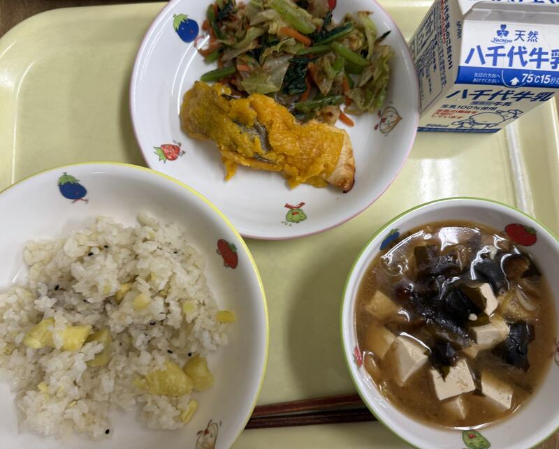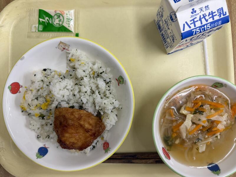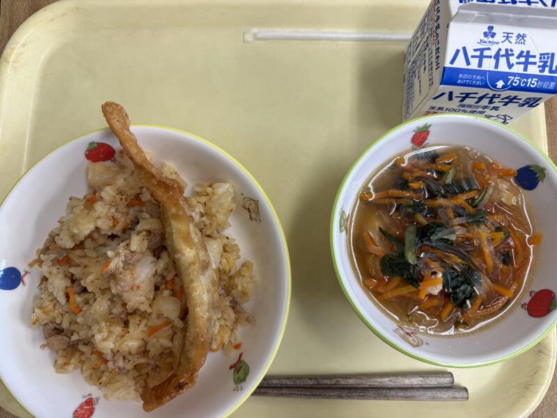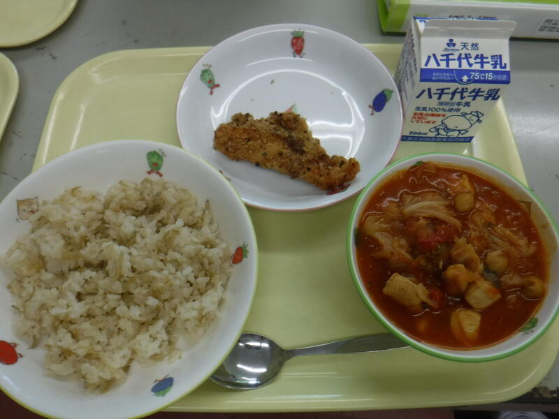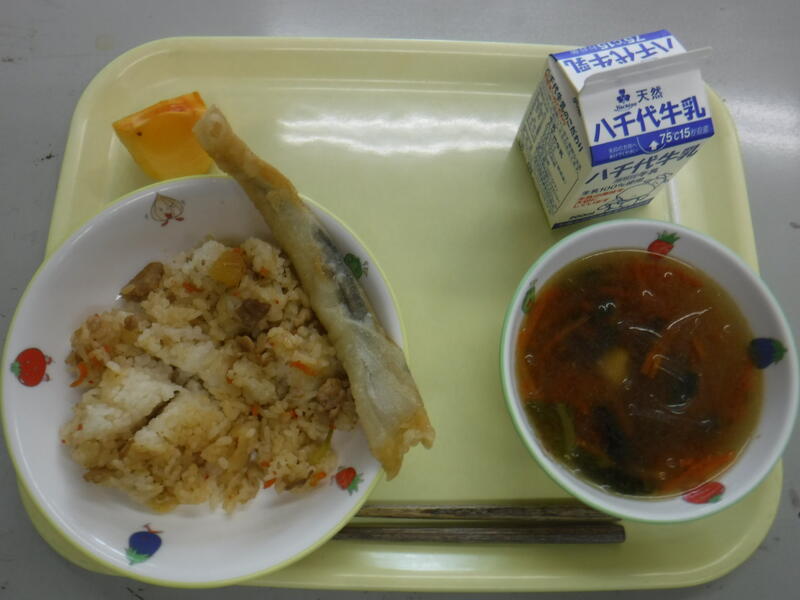 | コメント | 今日はちりめんじゃこが入ったご飯でした。給食では、頭から尻尾まで丸ごと食べることができる小魚をよく使っています。これは、骨を丈夫にしてほしいという給食室の先生の願いが込められています。大きくなっても、元気に動くために、小魚や牛乳、野菜などを積極的に食べて、カルシウムをとって、丈夫な体を作りましょう。 |