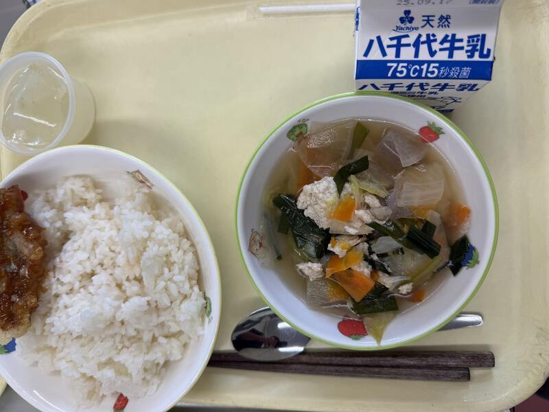 なっぱめし さといものからあげ とうふチゲ 牛乳 |