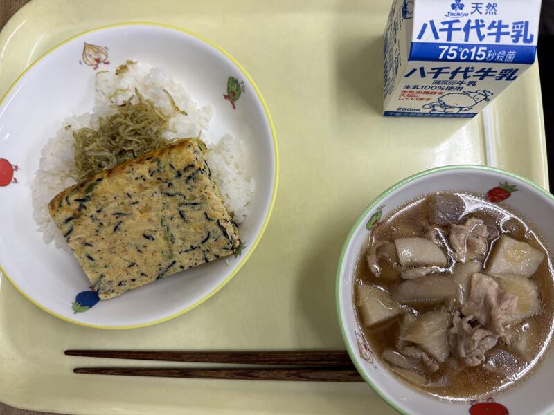 ごはん じゃこカレーふりかけ ひじきたまごやき いもにじる 牛乳 |