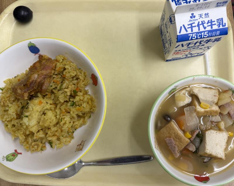 カレーピラフ タンドリーチキン ようふうにこみ ぶどう 牛乳 |