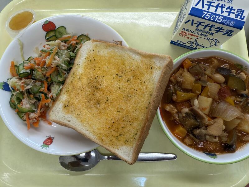 ガーリックトースト ツナサラダ ラタトゥイユ ひとくちマンゴーゼリー 牛乳 |