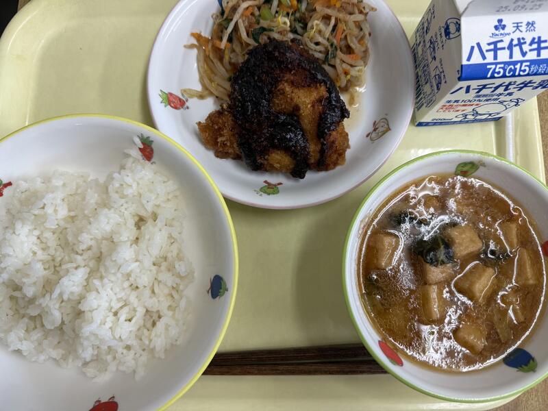 ごはん チキンみそかつ うめおかかあえ ジャガイモのみそしる 牛乳 |