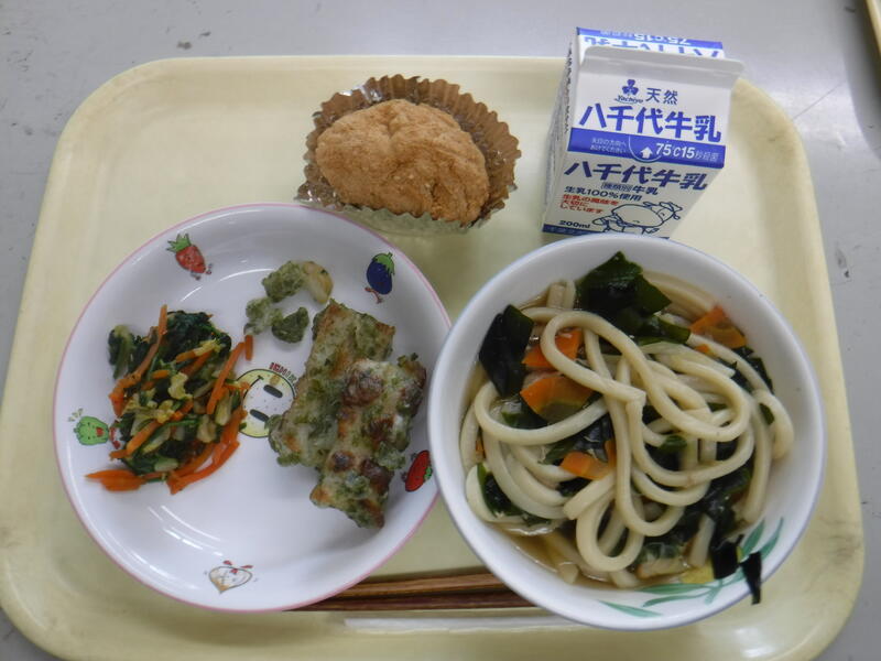 わかめうどん ちくわのいそべあげ はくさいのゆずづけ きなこおはぎ 牛乳 |