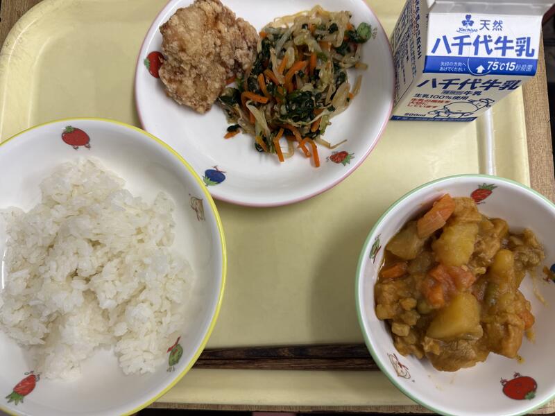 ごはん 鶏のからあげ ごまあえ インド煮 牛乳 |