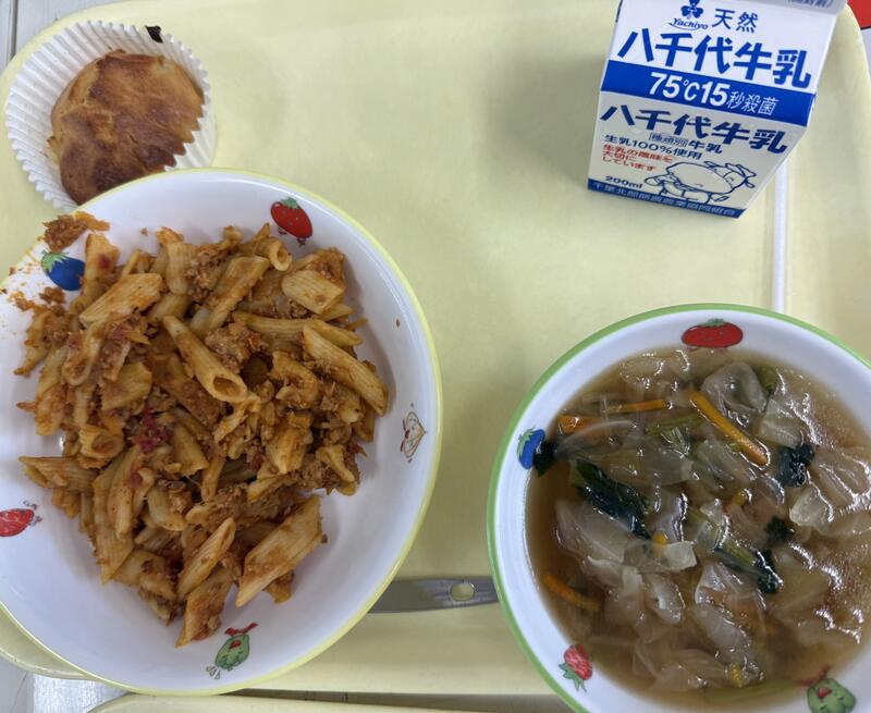 ペンネミートソース キャベツのベーコンスープ なしのしっとりマフィン 牛乳 |