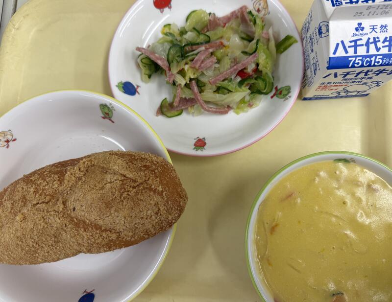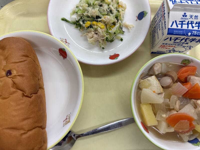 さつまいもパン ポトフ キャベツとささみのサラダ 牛乳 |