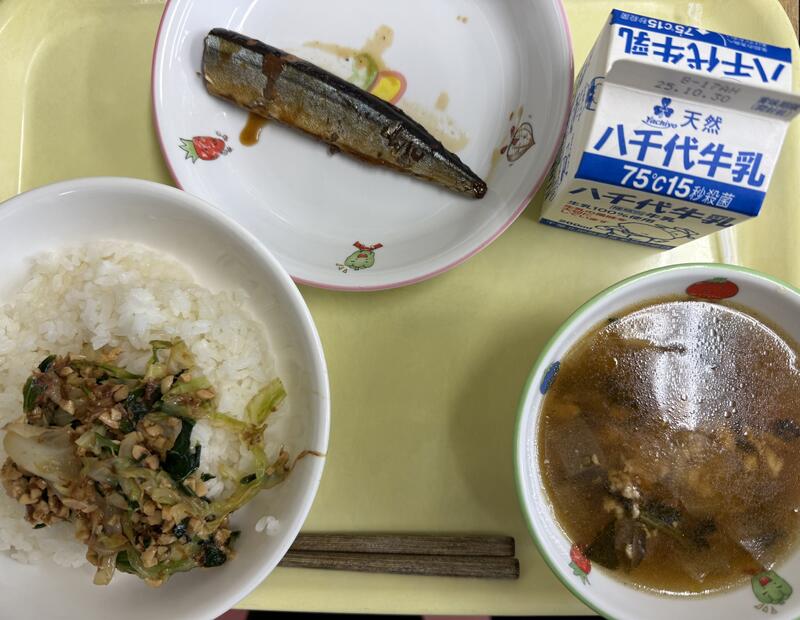 ごはん なっとうあえ さんまのかんろに だいこんのそぼろじる 牛乳 |