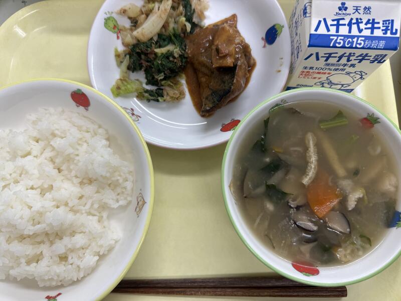 ごはん さばのみそに いぶりがっこあえ きびだんごじる 牛乳 |