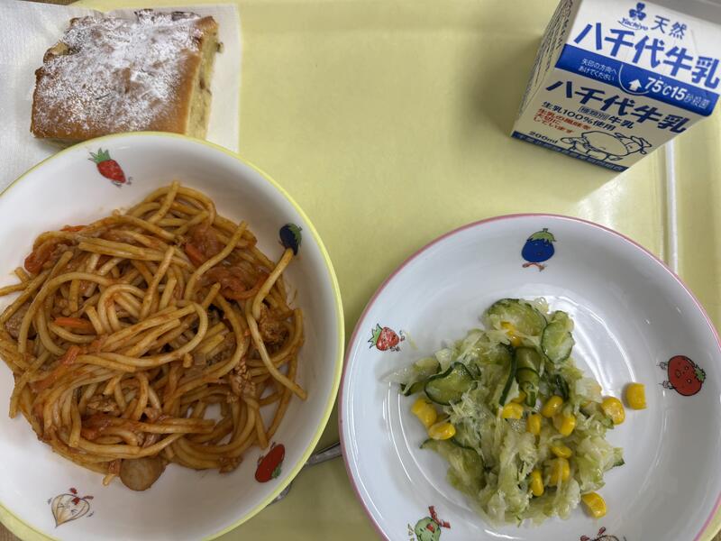 スパゲティナポリタン コールスローサラダ りんごとさつまいものケーキ 牛乳 |