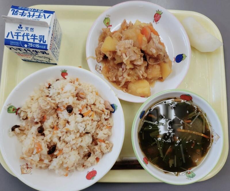 たきこみごはん にくじゃがぴりからに とうがんのすましじる いちかわのなし |