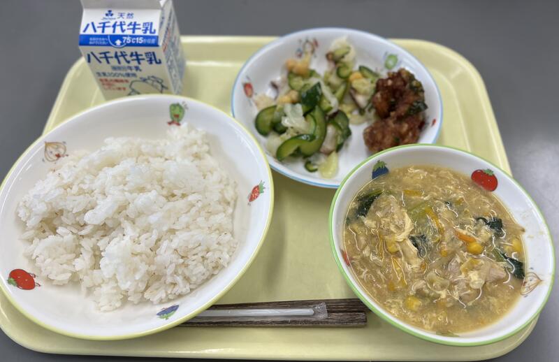 むぎごはん ユーリンチー ちゅうかふうコーンスープ たことまめのサラダ |