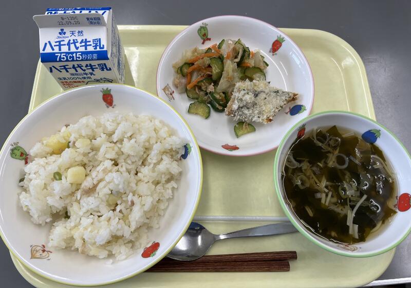 たきこみごはん あじのカラフルドレッシング はっぽうみそしる ぎゅうにゅう |