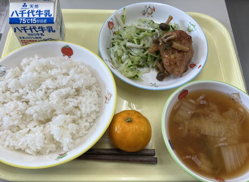 むぎごはん はすのわふうハンバーグ はくさいのみそしる だいこんサラダ れいとうみかん |