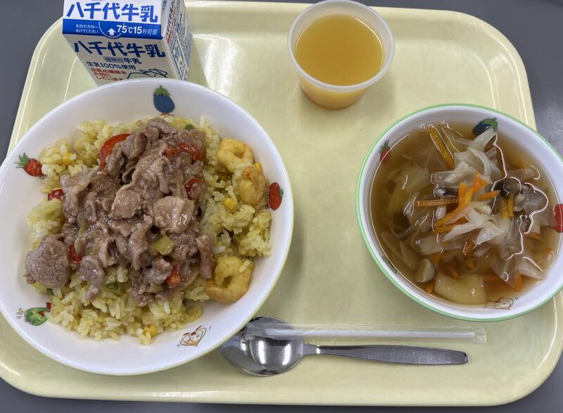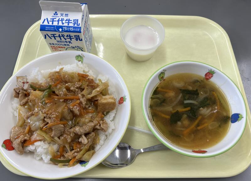 ごはん やきにくどんのぐ、やさい かきたまじる こうはくミルクゼリー ぎゅうにゅう |