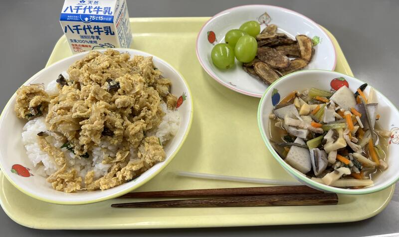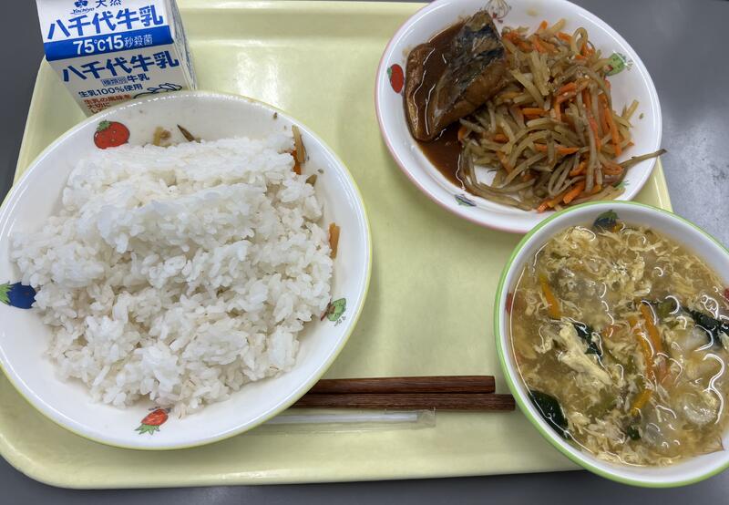 むぎごはん さけのみそマヨネーズやき ごもくきんぴら かきたまじる エコひじきふりかけ ぎゅうにゅう |