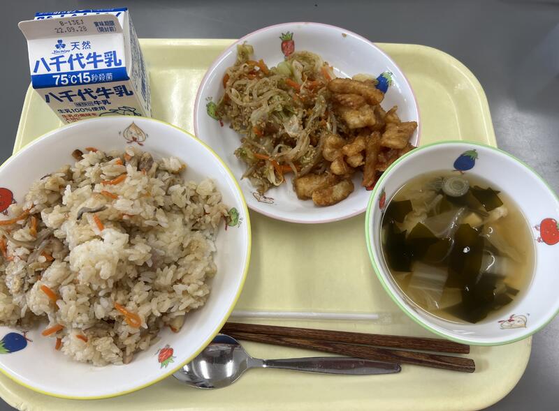 あさりごはん ししゃもはるまき きゃべつのおかかあえ とうふとわかめのみそしる ヨーグルト ぎゅうにゅう |
