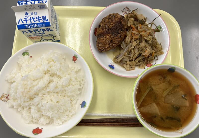 ごはん とうふハンバーグ じゃがいものおかかあえ ちゅうかスープ ぎゅうにゅう |