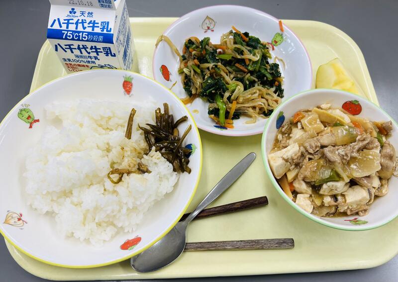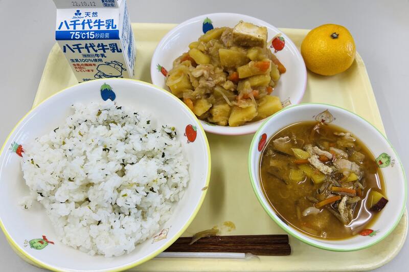わかめごはん ひりゅうずとかぼちゃのたきあわせ さわにわん ぎゅうにゅう |