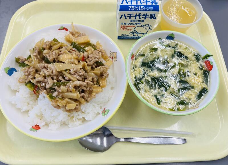 ごはん チンジャオロースどんのぐ にらとたまごのスープ |