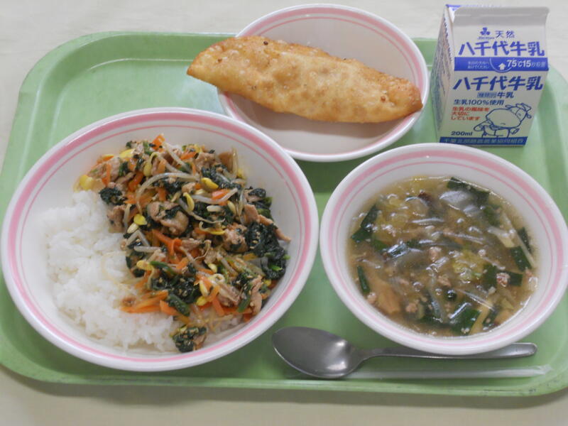 ごはん ビビンバ(具) 春雨スープ かぼちゃの包み揚げ 牛乳 |
