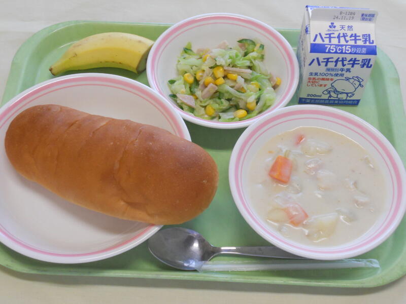 千葉県のさつまいもパン ホワイトシチュー(米粉) コールスローサラダ バナナ 牛乳 |
