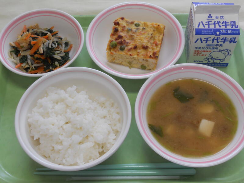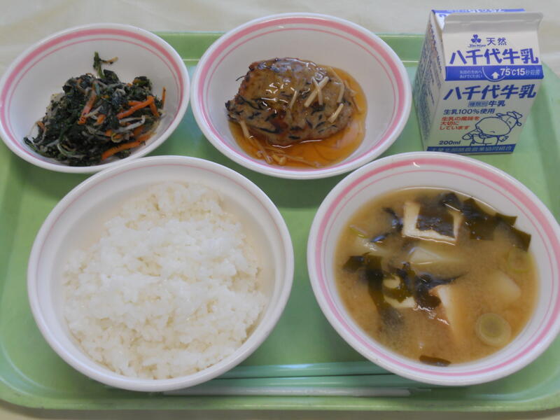 | コメント | 茎わかめのみそ汁の味がおいしいです。茎わかめの食感もよかったです。歯ごたえが感じられるので、生徒たちもよくかんで食べると思います。ピーマンの肉詰めは、絵本(『ピーマンのにくづめだったもののはなし』)のように肉がとれることなく、くっついたまま、おいしくいただくことができました。切干大根もやわらかく、かといってやわらかすぎず、おいしかったです。ごちそうさまでした。 |
