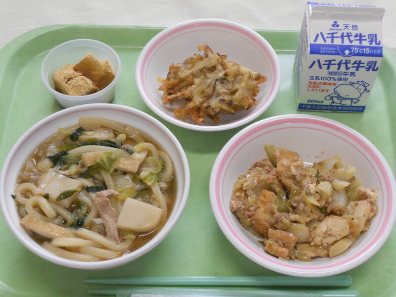 煮込みうどん もずくかき揚げ キャベツと生揚げのオイスター炒め わらびもち 牛乳 |