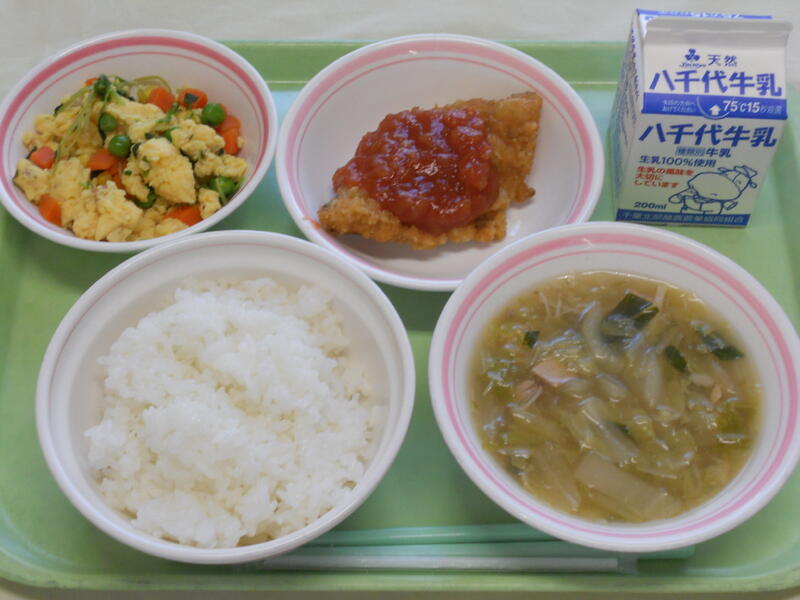 ごはん タラのチリソースかけ 豆苗の卵炒め 中華風白菜スープ 牛乳 |