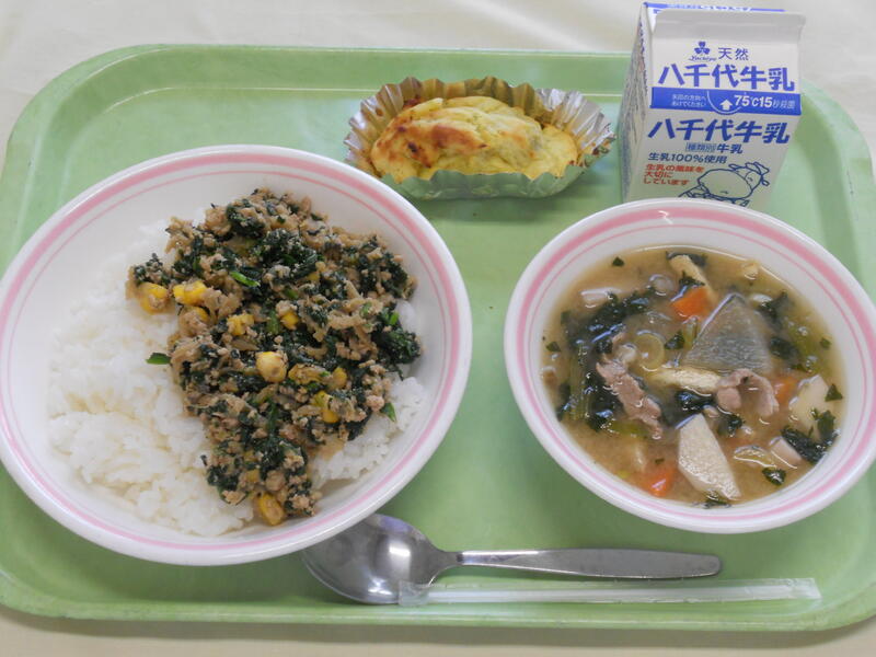 | コメント | じゃこ飯は、じゃことしその味がとてもよく、しっかりとかんで食べられるメニューだと思います。肉団子は周りがカリカリとしていて、おいしかったです。レバーそぼろが入っていますが、レバーが苦手な生徒もサクッと食べられると思います。入っているおからとひじきもいい感じでした。明日のレバーそぼろを使った三色丼も楽しみです。 |