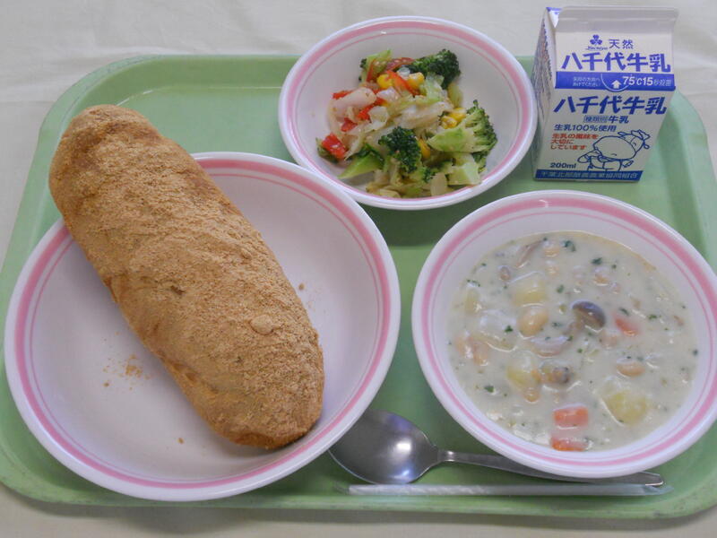 | コメント | きなこ揚げパンは、よくテレビ番組で懐かしい給食として目にすることがありますが、普段から給食が食べられて幸せです。揚げパンは、いつもですが、ベタベタしていなくてとても食べやすかったです。サラダとクラムチャウダーの取り合わせもよかったです。 |