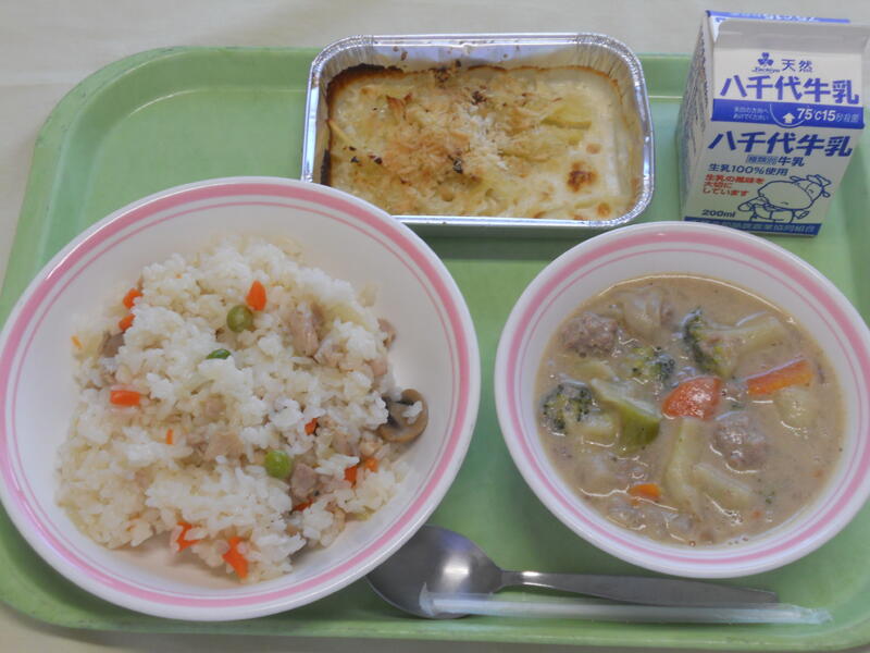 | コメント | さつまいもパンは、ほんのり甘くてやわらかく、おいしかったです。しっとりしていました。ホワイトシチューは米粉が使われているのですね。豆乳も入っていて、ヘルシーで栄養もありおいしい、最強シチューでした。野菜の大きさも、しっかりと野菜が感じられ、噛む、押しつぶすことができる大きさでした。ごちそう様でした。 |