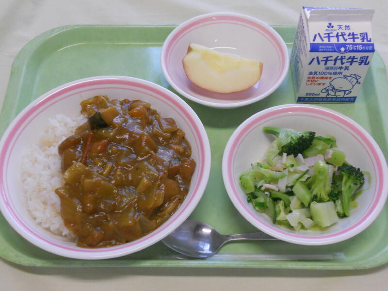 | コメント | おはなし給食「ラージャの魚カレー」は、小さく切って、衣をつけて揚げた魚やかぼちゃが入っていました。やさしい味で、具もトロトロでおいしかったです。グリーンサラダには、ブロッコリー、キャベツ、きゅうりなどたくさんの野菜とハムが入っていて、栄養満点でした。ごちそうさまでした。 |